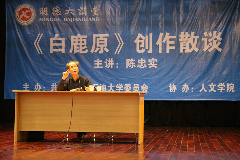 明德大講堂是校團(tuán)委為活躍校園文化、提升大學(xué)生綜合素養(yǎng)而舉辦的一項(xiàng)特色活動(dòng),很受師生歡迎。2010年4月15日,陳忠實(shí)走進(jìn)新校區(qū)做客明德大講堂,以《我的讀書(shū)生活》為題,為師生講述了趙樹(shù)理、柳青、柯切托夫、莫泊桑等一批作家對(duì)自己讀書(shū)生活的影響,同時(shí)肯定了歐洲古典主義文學(xué)、現(xiàn)實(shí)主義文學(xué)、魔幻現(xiàn)實(shí)主義、蘇聯(lián)文學(xué)對(duì)自己藝術(shù)創(chuàng)作的積極影響。先生用濃濃的陜西方言,結(jié)合《白鹿原》的創(chuàng)作歷程,講述了自己多年來(lái)的寫(xiě)作感悟和體會(huì),表達(dá)著自己對(duì)黃土地的眷戀和熱愛(ài),同時(shí)他還建議同學(xué)們?cè)趯W(xué)習(xí)之余要多讀名著、鑒賞藝術(shù)品,注重視生活細(xì)節(jié),這樣在創(chuàng)作時(shí)便可直接進(jìn)入生活。言之切,情之深,先生的講座讓聽(tīng)者動(dòng)容。