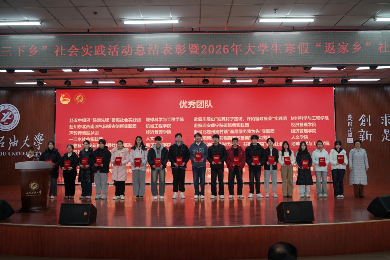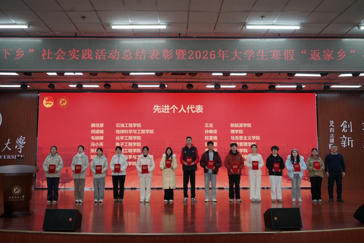 種宇宏為2026年大學(xué)生寒假“返家鄉(xiāng)”社會(huì)實(shí)踐團(tuán)隊(duì)代表授旗,校團(tuán)委負(fù)責(zé)人宣讀了《關(guān)于2025年大學(xué)生暑期“三下鄉(xiāng)”社會(huì)實(shí)踐活動(dòng)總結(jié)表彰的通知》《關(guān)于開(kāi)展西安石油大學(xué)2026年大學(xué)生寒假“返家鄉(xiāng)”社會(huì)實(shí)踐的通知》,與會(huì)部門(mén)負(fù)責(zé)人分別為2025年大學(xué)生暑期“三下鄉(xiāng)”社會(huì)實(shí)踐先進(jìn)個(gè)人代表、優(yōu)秀團(tuán)隊(duì)、標(biāo)兵團(tuán)隊(duì)、優(yōu)秀指導(dǎo)老師、優(yōu)秀組織單位頒獎(jiǎng)。電子工程學(xué)院自動(dòng)化2402班張晨曦同學(xué)、經(jīng)濟(jì)管理學(xué)院國(guó)貿(mào)2301班權(quán)雨晨同學(xué)分別代表2025年大學(xué)生暑期“三下鄉(xiāng)”社會(huì)實(shí)踐獲獎(jiǎng)團(tuán)隊(duì)和2026年大學(xué)生寒假“返家鄉(xiāng)”社會(huì)實(shí)踐團(tuán)隊(duì)作了交流發(fā)言。