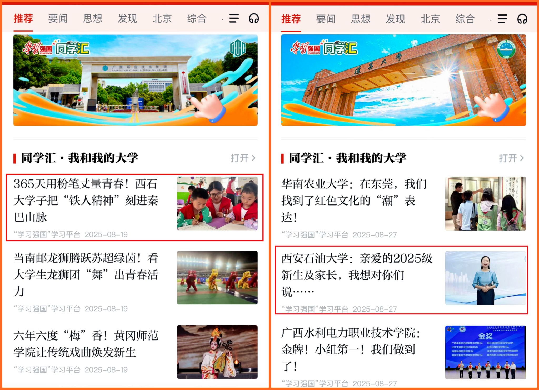 “同學(xué)匯”是“學(xué)習(xí)強國”學(xué)習(xí)平臺為貫徹落實習(xí)近平總書記關(guān)于加強和改進高校思想政治工作的重要論述,面向高校、服務(wù)大學(xué)生而研發(fā)的一款主流融媒體產(chǎn)品,支持高校發(fā)布圖文、短視頻等多種形式內(nèi)容。2025年以來,“西安石油大學(xué):祝你高考落筆生花,共赴能源報國夢”“西安石油大學(xué)學(xué)子暑假在干嘛?看這里”“365天用粉筆丈量青春!西石大學(xué)子把‘鐵人精神’刻進秦巴山脈”“西安石油大學(xué):親愛的2025級新生及家長,我想對你們說……”等內(nèi)容多次獲得“學(xué)習(xí)強國”學(xué)習(xí)平臺“推薦”頻道相關(guān)欄目首頁推薦。學(xué)校11次上榜一月一期的“學(xué)習(xí)強國”同學(xué)匯高校榜,進一步提高了學(xué)校的影響力和美譽度。