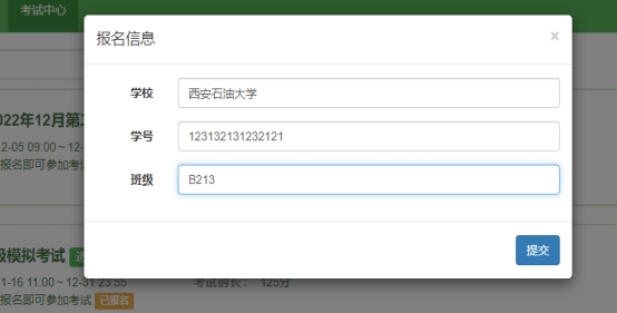 2、登錄成功后點(diǎn)擊“考試中心”,點(diǎn)擊對(duì)應(yīng)的場(chǎng)次“去報(bào)名”,填寫好自己的個(gè)人信息,點(diǎn)擊確定后即可報(bào)名成功,要保證個(gè)人信息無誤,避免影響成績(jī)。(班級(jí)填寫教學(xué)班,如B213)