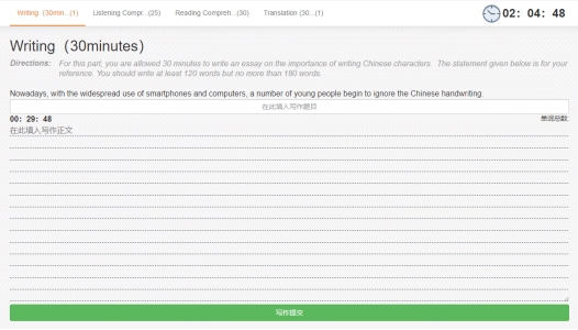 1、試卷一經(jīng)提交即可獲取測(cè)試成績(jī)和參考答案,作文翻譯由批改網(wǎng)系統(tǒng)智能批改評(píng)閱,如提交后沒有翻譯和寫作成績(jī),是因當(dāng)時(shí)瞬時(shí)分析任務(wù)過多在排隊(duì)處理,請(qǐng)隔日再登錄查詢。
