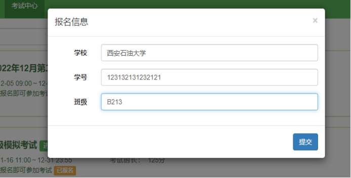 2、登錄成功后點(diǎn)擊“考試中心”,點(diǎn)擊對(duì)應(yīng)的場(chǎng)次,如英語一(或英語二)“去報(bào)名,填寫好自己的個(gè)人信息,點(diǎn)擊確定后即可報(bào)名成功,要保證個(gè)人信息無誤,避免影響成績(jī)。(班級(jí)可忽略)