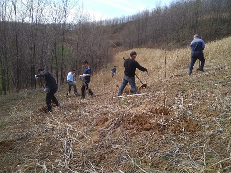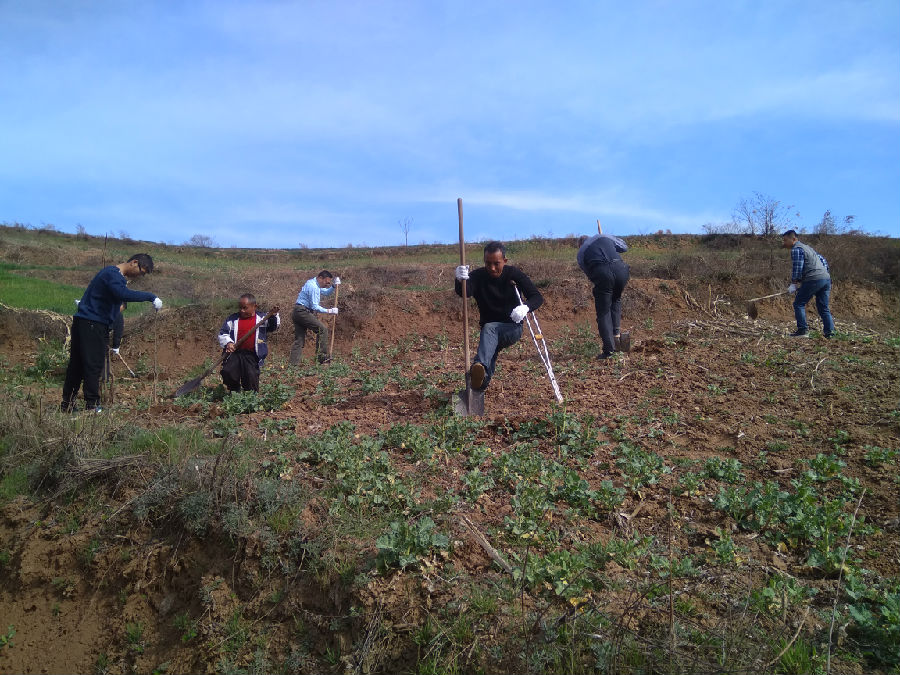馬書記一行首先來到結對幫扶困難群眾王歲仔的家中,代表地學院向王歲仔送上了學院師生捐贈的衣物兩包,并了解了他的近期生產生活情況。隨后,馬書記一行帶著提前購買的核桃樹苗、鐵鍬等農具,來到十多里外王歲仔位于老村的撂荒坡地,幫助王歲仔種植核桃樹苗。大家一起動手,干勁十足,在兩畝多坡地上種植了一百余棵核桃樹苗。幫助王歲仔利用撂荒坡地種植經濟林木是地學院精準扶貧工作的一項具體舉措,為此,地學院提前聯系我校駐村扶貧干部董丙劍老師幫助購買了核桃樹苗,考慮到王歲仔腿部有殘疾,無法從事體力勞動,學院此次專門組織教職工幫助其栽種樹苗。