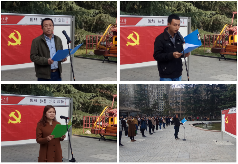 在雄壯的《國(guó)際歌》聲,石工類2016級(jí)第一黨支部何接宣布宣誓儀式正式開始。110名新黨員面向黨旗,舉起右手,在領(lǐng)誓人研究生院機(jī)械類2016級(jí)第一黨支部趙華東的逐句領(lǐng)讀下,用慷慨激昂的語氣,莊嚴(yán)向黨旗宣誓,表達(dá)對(duì)黨的忠誠(chéng)、為共產(chǎn)主義事業(yè)奮斗終身的決心。其他參會(huì)人員與新黨員一同宣誓,重溫入黨誓詞。新黨員代表研究生院石工類2015級(jí)第一黨支部劉夢(mèng)文同學(xué)作了表態(tài)發(fā)言,結(jié)合研究生日常學(xué)習(xí)工作生活,談了一名共產(chǎn)黨員的擔(dān)當(dāng)和責(zé)任,表明了自己投身黨的事業(yè)的決心和勇氣。