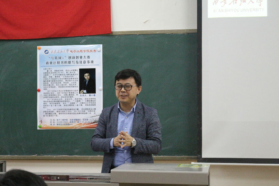 3月8日晚19點(diǎn),電子工程學(xué)院在鄠邑校區(qū)C3實(shí)驗(yàn)樓419教室成功舉辦了題為《商業(yè)計(jì)劃書的撰寫及注意事項(xiàng)》的專題講座。此次講座邀請(qǐng)到高級(jí)經(jīng)濟(jì)師、山水智慧企業(yè)管理咨詢有限公司CEO董小泰老師擔(dān)任主講。電子工程學(xué)院黨委副書記黃建禮、2016級(jí)輔導(dǎo)員梁琦、青年教師顏謹(jǐn)?shù)戎笇?dǎo)老師以及申報(bào)“互聯(lián)網(wǎng)+”創(chuàng)新創(chuàng)業(yè)項(xiàng)目的同學(xué)參加此次專題講座。