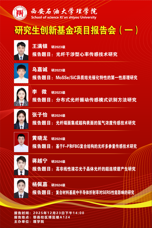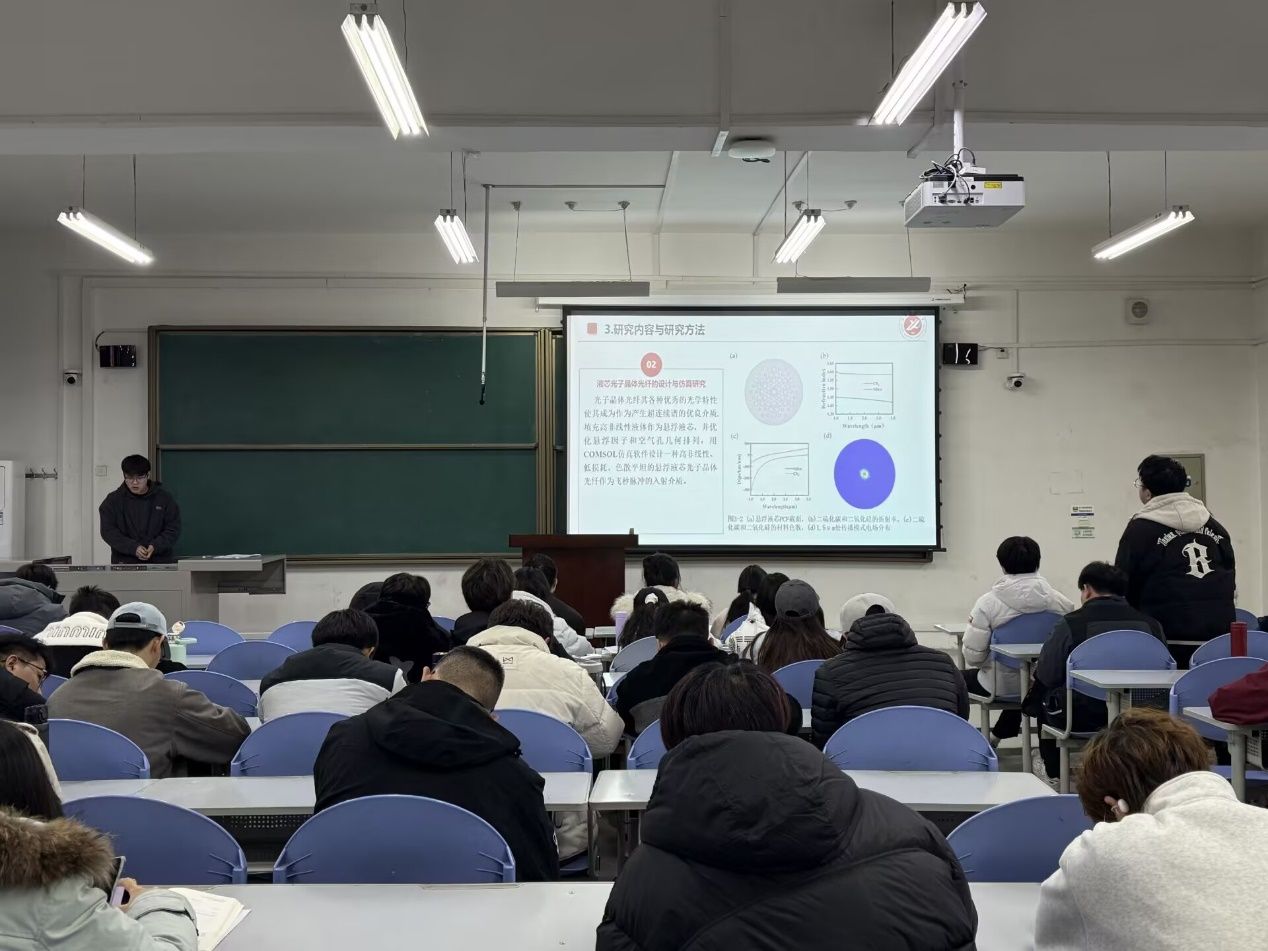 12月23日,第一場(chǎng)報(bào)告會(huì)聚焦光纖傳感、光催化、超連續(xù)譜產(chǎn)生等方向:王滿銀同學(xué)圍繞“光纖干涉型心率傳感技術(shù)”,介紹了人體生理參數(shù)傳感領(lǐng)域的新型檢測(cè)方法;烏嘉誠(chéng)同學(xué)基于第一性原理,剖析了MoSSe/SiC異質(zhì)結(jié)的光催化特性;李微、張子怡、黃曉龍等同學(xué)則分別針對(duì)分布式光纖振動(dòng)傳感、氫氣濃度傳感、多參量傳感等技術(shù)展開匯報(bào);蔣越寧、楊佩嘉同學(xué)的研究則覆蓋了高非線性液芯光子晶體光纖、復(fù)合材料基底SERS性能等課題。