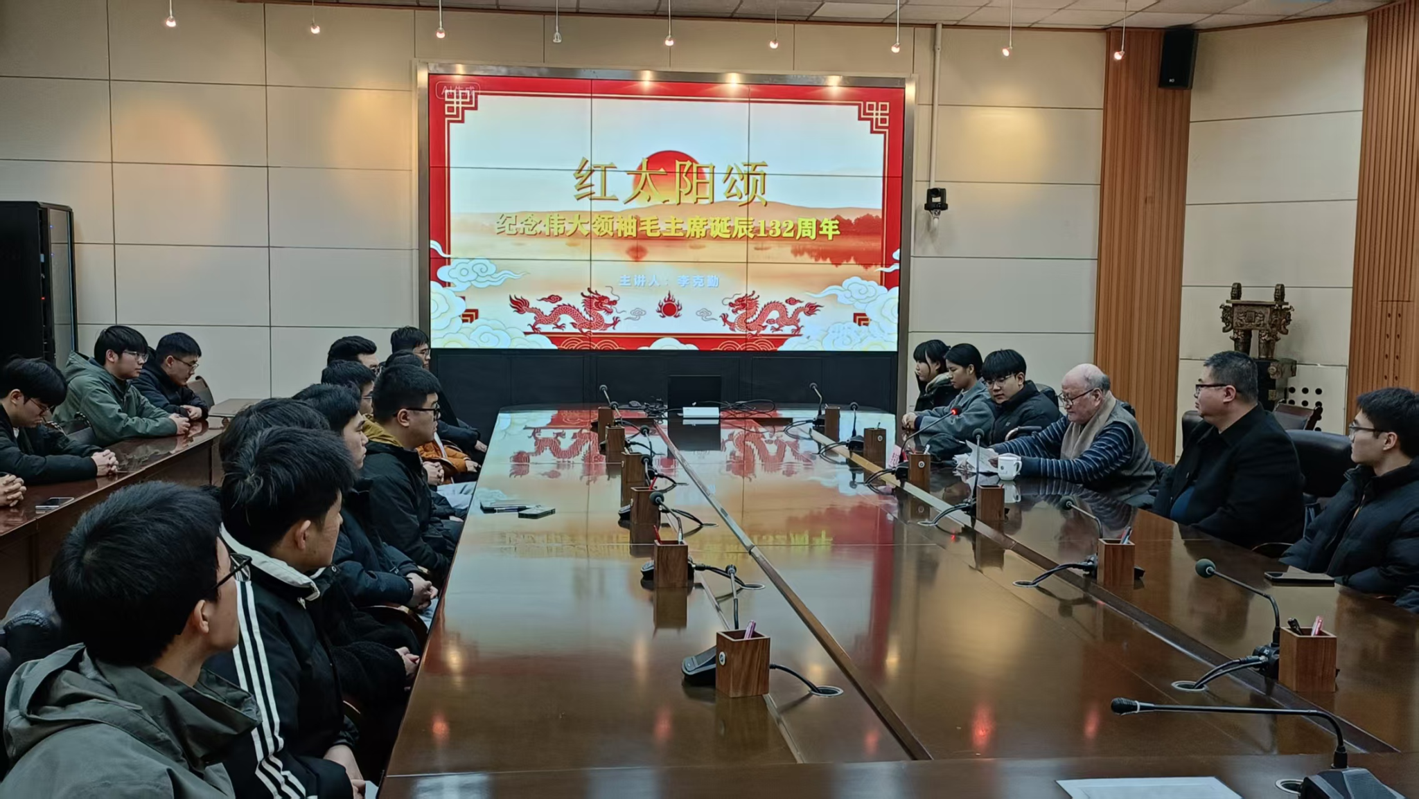 12月26日下午,在雁塔校區(qū)會議中心第二會議室,離退休教職工李克勤書記以“紅太陽頌”為主題,在紀念偉大領(lǐng)袖毛澤東主席誕辰132周年之際,為機械工程學院研究生代表奉獻了一場兼具思想性、指導性與趣味性的分享會,由離退休工作處副處長趙海濤主持。