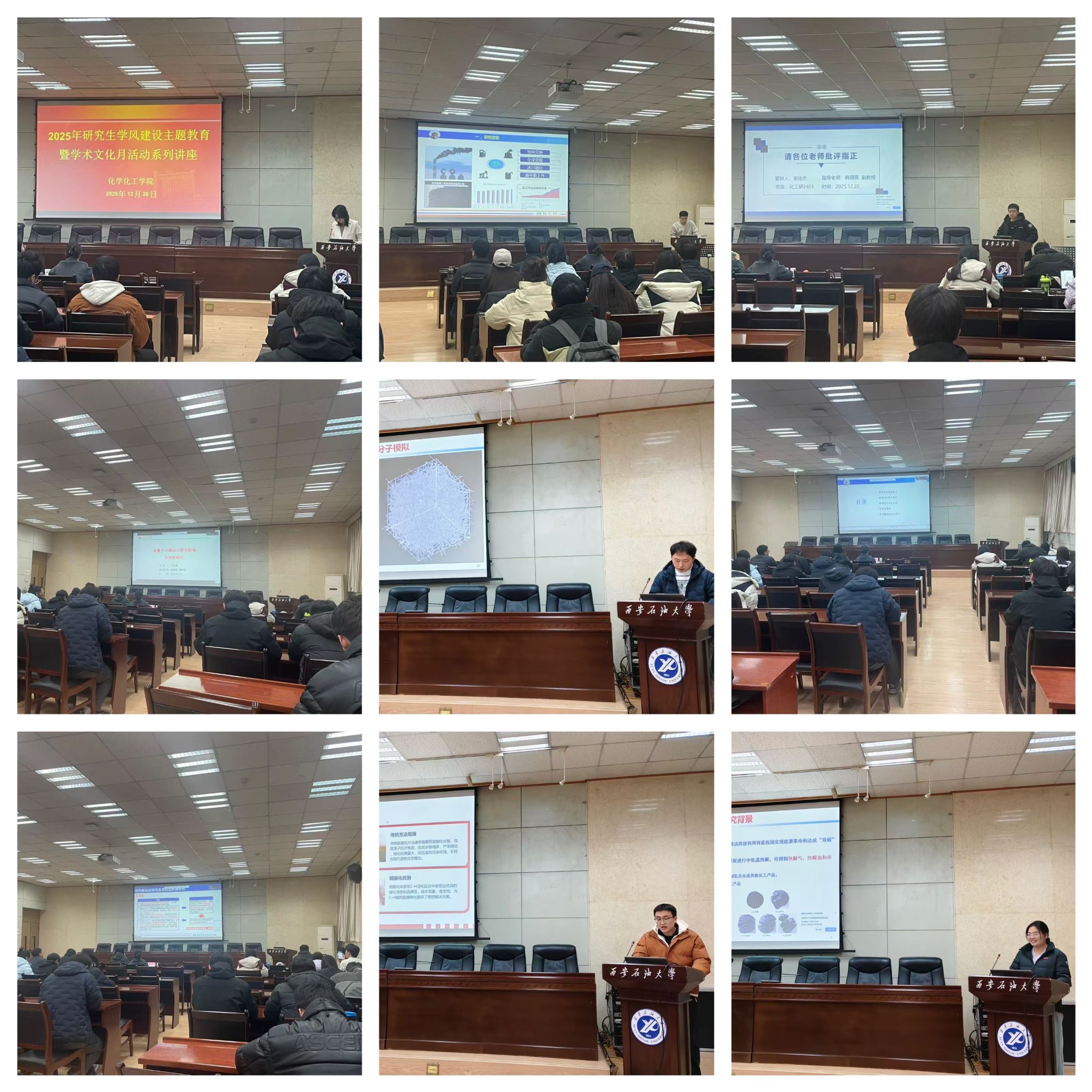 為持續(xù)深化研究生學(xué)風(fēng)建設(shè),搭建多領(lǐng)域?qū)W術(shù)交流平臺(tái),營(yíng)造開拓創(chuàng)新、求真務(wù)實(shí)的學(xué)術(shù)氛圍,根據(jù)學(xué)校研究生工作部關(guān)于2025年研究生學(xué)風(fēng)建設(shè)暨學(xué)術(shù)文化活動(dòng)月的安排部署,12月26日下午,化學(xué)化工學(xué)院在雁塔校區(qū)會(huì)議中心第三會(huì)議室成功舉辦2025年研究生學(xué)術(shù)文化月第三場(chǎng)學(xué)術(shù)報(bào)告。本場(chǎng)活動(dòng)聚焦材料合成、催化反應(yīng)、能源利用、數(shù)值模擬等多個(gè)前沿學(xué)術(shù)方向,八位優(yōu)秀研究生依次登臺(tái)匯報(bào),充分展現(xiàn)了扎實(shí)的科研功底與鮮明的創(chuàng)新思維。學(xué)院專業(yè)教師李冰、張榕,綜合辦公室秘書馮旭亮,研究生輔導(dǎo)員曹勃及各年級(jí)研究生代表齊聚現(xiàn)場(chǎng),線上線下同步參與,共同沉浸于濃厚的學(xué)術(shù)交流氛圍中。