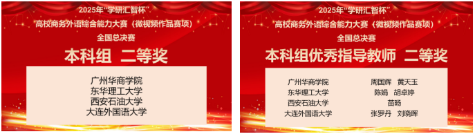 我校學(xué)子在2025年“學(xué)研匯智杯”高校商務(wù)外語(yǔ)綜合能力大賽(微視頻作品賽項(xiàng))全國(guó)總決賽中獲得佳績(jī)