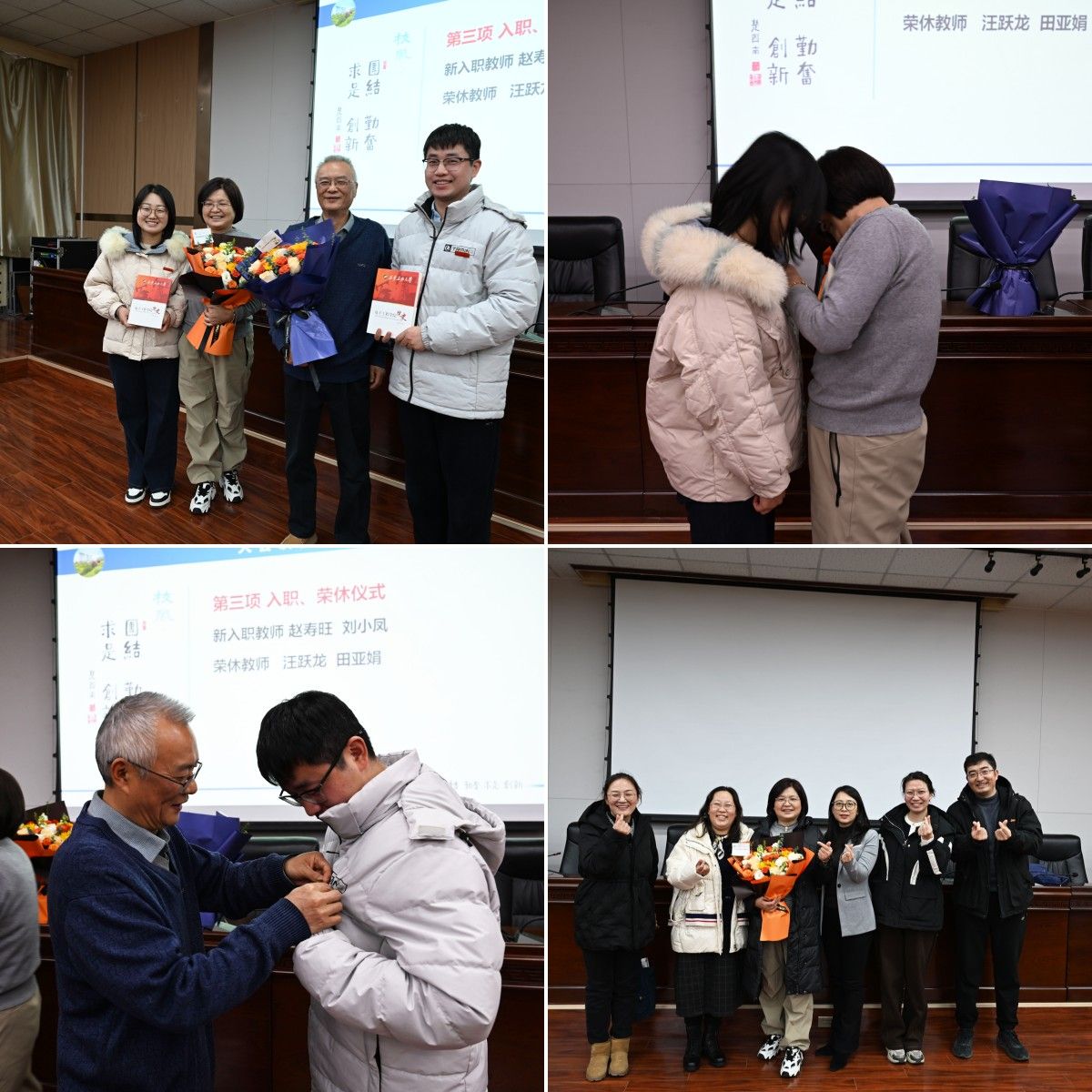 在大會(huì)第三項(xiàng)溫馨而莊重的入職與榮休儀式中,新入職教師趙壽旺、劉小鳳受到熱烈歡迎,退休教師汪躍龍、田亞娟在掌聲中接受敬意與祝福,并親自為新教師佩戴?;?、贈(zèng)送院史,象征學(xué)院精神薪火相傳。學(xué)院對(duì)榮休教師多年來(lái)為學(xué)院發(fā)展作出的貢獻(xiàn)表示衷心感謝,并鼓勵(lì)新教師傳承學(xué)院優(yōu)良傳統(tǒng),續(xù)寫事業(yè)發(fā)展新篇章。