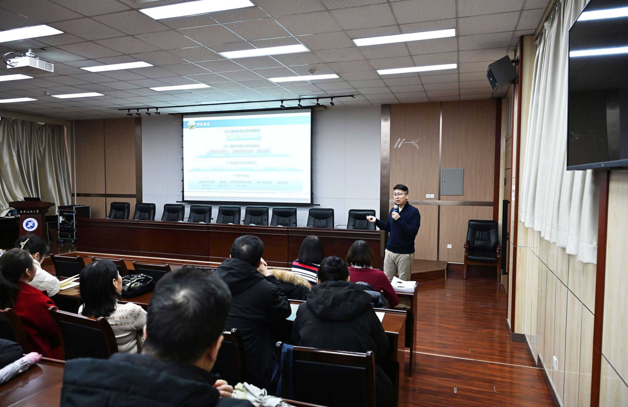 會(huì)議第一項(xiàng)為年終述職環(huán)節(jié),李飛院長(zhǎng)圍繞學(xué)科發(fā)展作專題報(bào)告。他系統(tǒng)闡述了申報(bào)博士點(diǎn)的重要性與緊迫性,強(qiáng)調(diào)必須立足儀器學(xué)科實(shí)現(xiàn)突破。報(bào)告梳理了學(xué)院在科研、師資、人才方面的進(jìn)展與不足,明確了“測(cè)、傳、、”的特色方向及三個(gè)重點(diǎn)科研領(lǐng)域。李飛同時(shí)號(hào)召全院教師凝聚共識(shí),以博士點(diǎn)申報(bào)和學(xué)科排名提升為核心目標(biāo),共同推動(dòng)學(xué)院內(nèi)涵式發(fā)展。