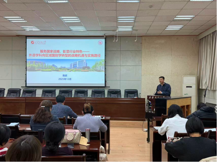 隨后,副院長(zhǎng)陳武做全院教學(xué)科研工作動(dòng)員,并就“服務(wù)國(guó)家戰(zhàn)略,彰顯行業(yè)特色——外語(yǔ)學(xué)科向區(qū)域國(guó)別學(xué)轉(zhuǎn)型的戰(zhàn)略機(jī)遇與實(shí)施路徑”進(jìn)行專題報(bào)告。報(bào)告深入分析人工智能時(shí)代外語(yǔ)學(xué)科面臨的挑戰(zhàn)與機(jī)遇,明確指出在科技革新和國(guó)家戰(zhàn)略需求升級(jí)的雙重驅(qū)動(dòng)下,外語(yǔ)學(xué)科須突破傳統(tǒng)語(yǔ)言技能培養(yǎng)的局限,深化“外語(yǔ)+能源”復(fù)合型人才培養(yǎng)方向,尋求外語(yǔ)學(xué)科向區(qū)域國(guó)別學(xué)科的轉(zhuǎn)型。他強(qiáng)調(diào),學(xué)院將依托學(xué)校能源學(xué)科優(yōu)勢(shì)和“一帶一路”區(qū)位特征,聚焦中亞、中東等能源富集區(qū)的國(guó)別區(qū)域研究,推動(dòng)外語(yǔ)學(xué)科與能源、法律、國(guó)際傳播等領(lǐng)域的深度融合,逐步構(gòu)建起“學(xué)科為根、行業(yè)為體、戰(zhàn)略為魂”的特色發(fā)展格局。
