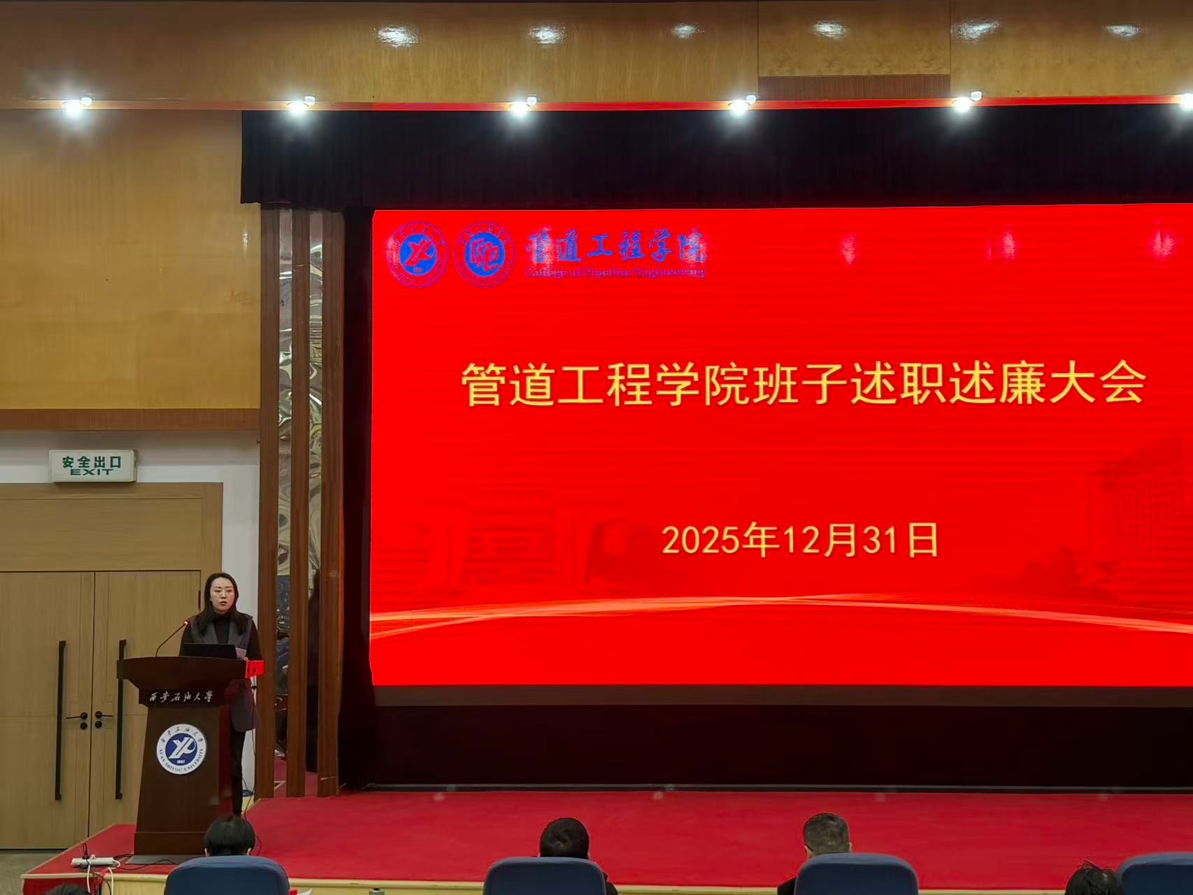 2025年12月31日,管道工程學(xué)院在雁塔校區(qū)學(xué)術(shù)報(bào)告廳召開(kāi)2025年度中層領(lǐng)導(dǎo)班子和處級(jí)干部述職述廉大會(huì),會(huì)議由學(xué)院黨委書記賈莉娜主持,學(xué)院全體教職工參會(huì)。